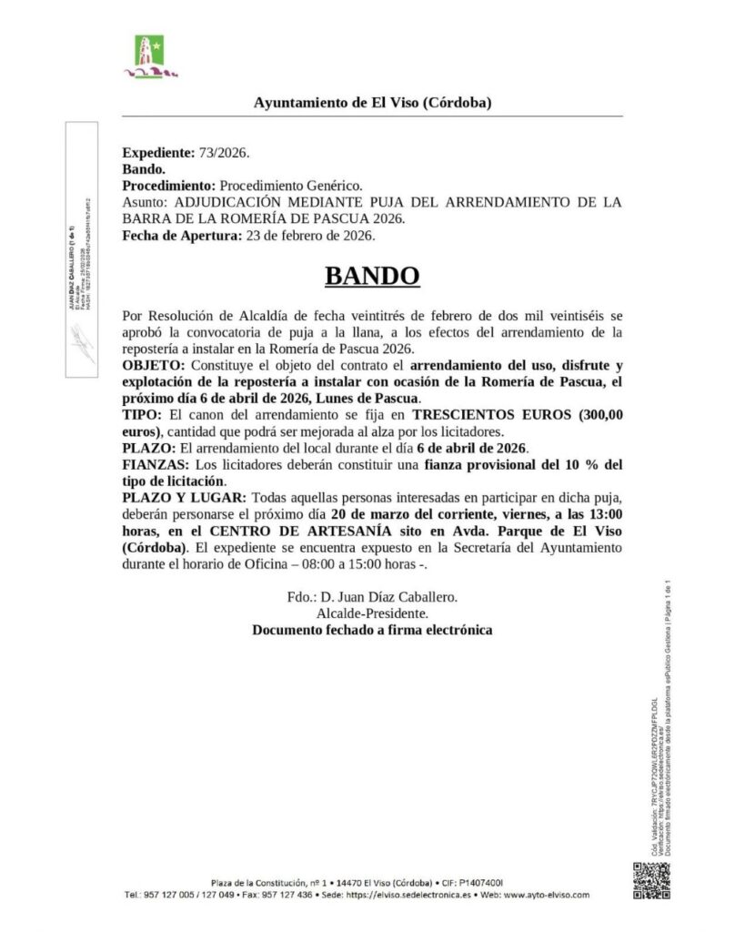 PLAZO Y LUGAR: Todas aquellas personas interesadas en participar en dicha puja, deberán personarse el próximo día 20 de marzo del corriente, viernes, a las 13:00 horas, en el CENTRO DE ARTESANÍA sito en Avda. Parque de El Viso (Córdoba). El expediente se encuentra expuesto en la Secretaría del Ayuntamiento durante el horario de Oficina – 08:00 a 15:00 horas-.