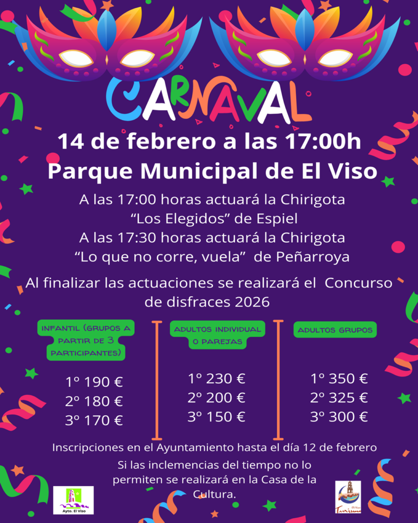 Informamos a la ciudadanía de que el próximo día 14 de febrero se celebrará en el Parque Municipal a las 17 horas el Carnaval.